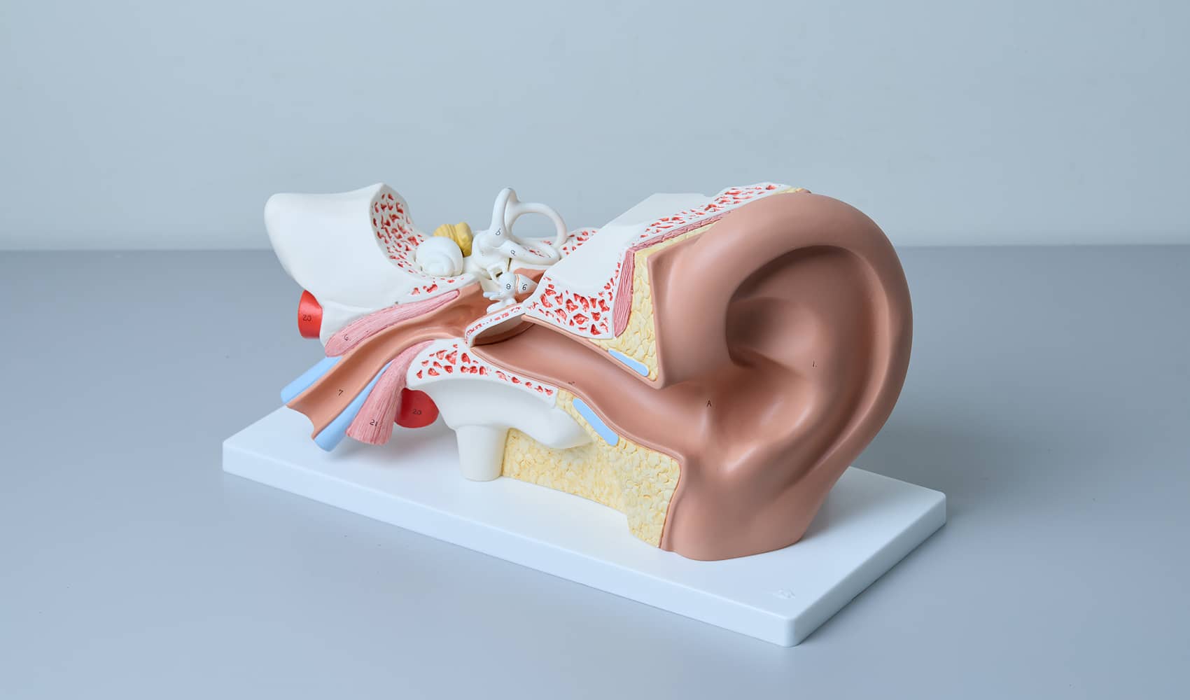 音を聴くための基本的な体の仕組みは、外耳道から入った音を鼓膜で受け止め、耳小骨という小さな骨の連なりを振動させ、その先の蝸牛へと音を伝えることで成り立っています。この音の伝達システムに何らかの問題が生じると、「伝音難聴」と呼ばれる聴覚障害が起こります。
