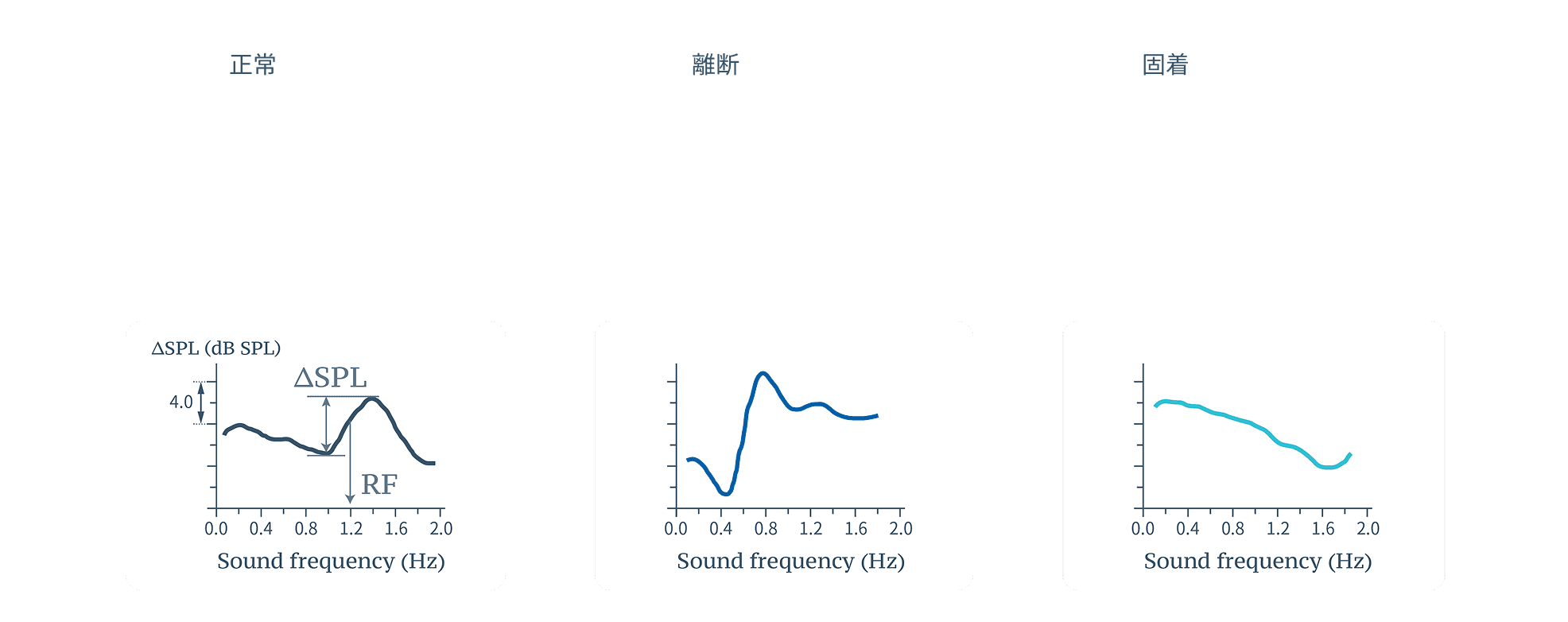 中耳全体が最も効率よく振動する周波数を示します。この周波数は中耳の「硬さ」を反映しており、耳小骨が固着すればRFは高くなり、離断すれば低くなるという明確な変化として現れます。