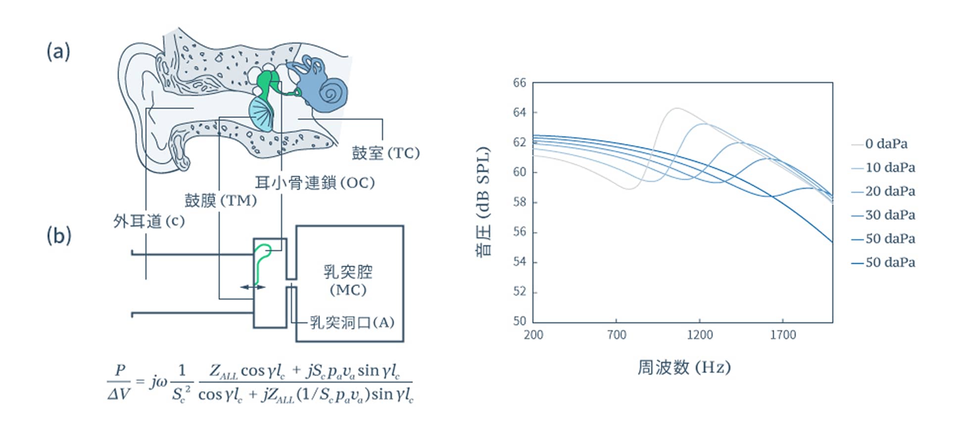 (a) は耳の解剖図。(b) はその等価回路モデル。