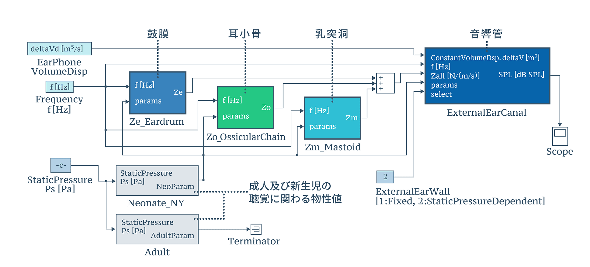 入力として、イヤホンの体積速度 deltaVd [m³/s] と周波数 f [Hz]、静的圧力 Ps [Pa] が与えられます。 上部には鼓膜、耳小骨、乳突洞、音響管の各部分に対応するモジュールが配置されています。