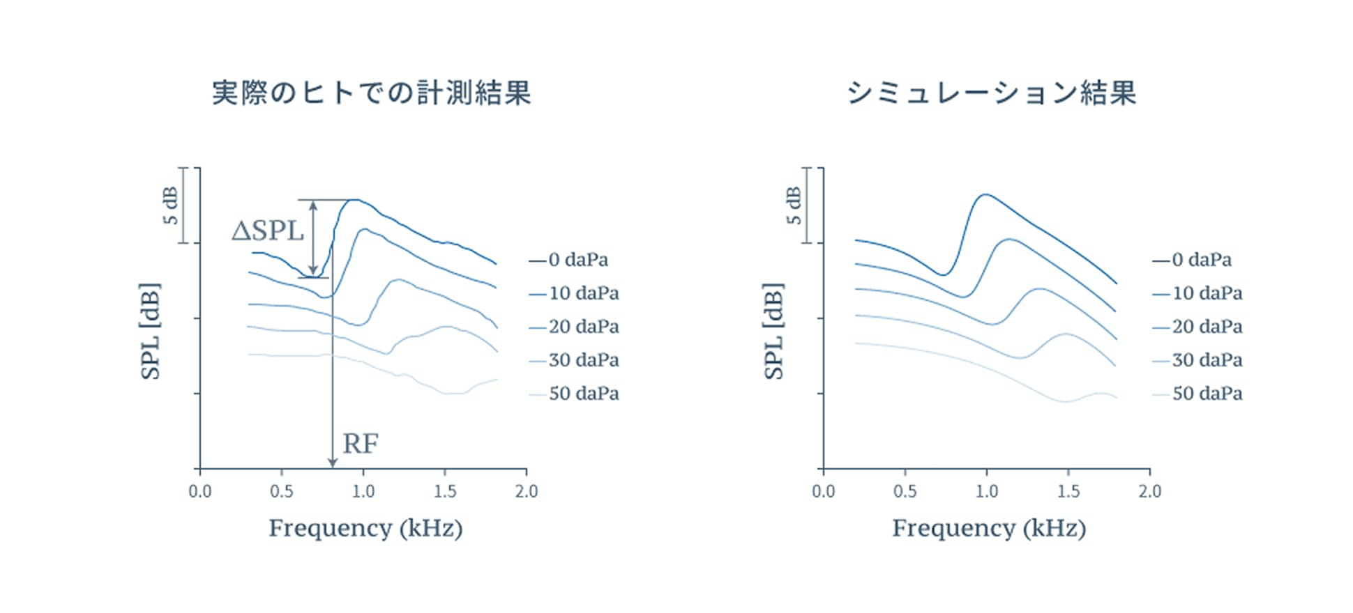 左側のグラフ「実際のヒトでの計測結果」において、ヒトの中耳系の共振周波数がRF(約1.0kHz付近)、また、鼓膜の動きやすさの指標となる音圧レベル変化がΔSPL(約5dB)としてマークされています。