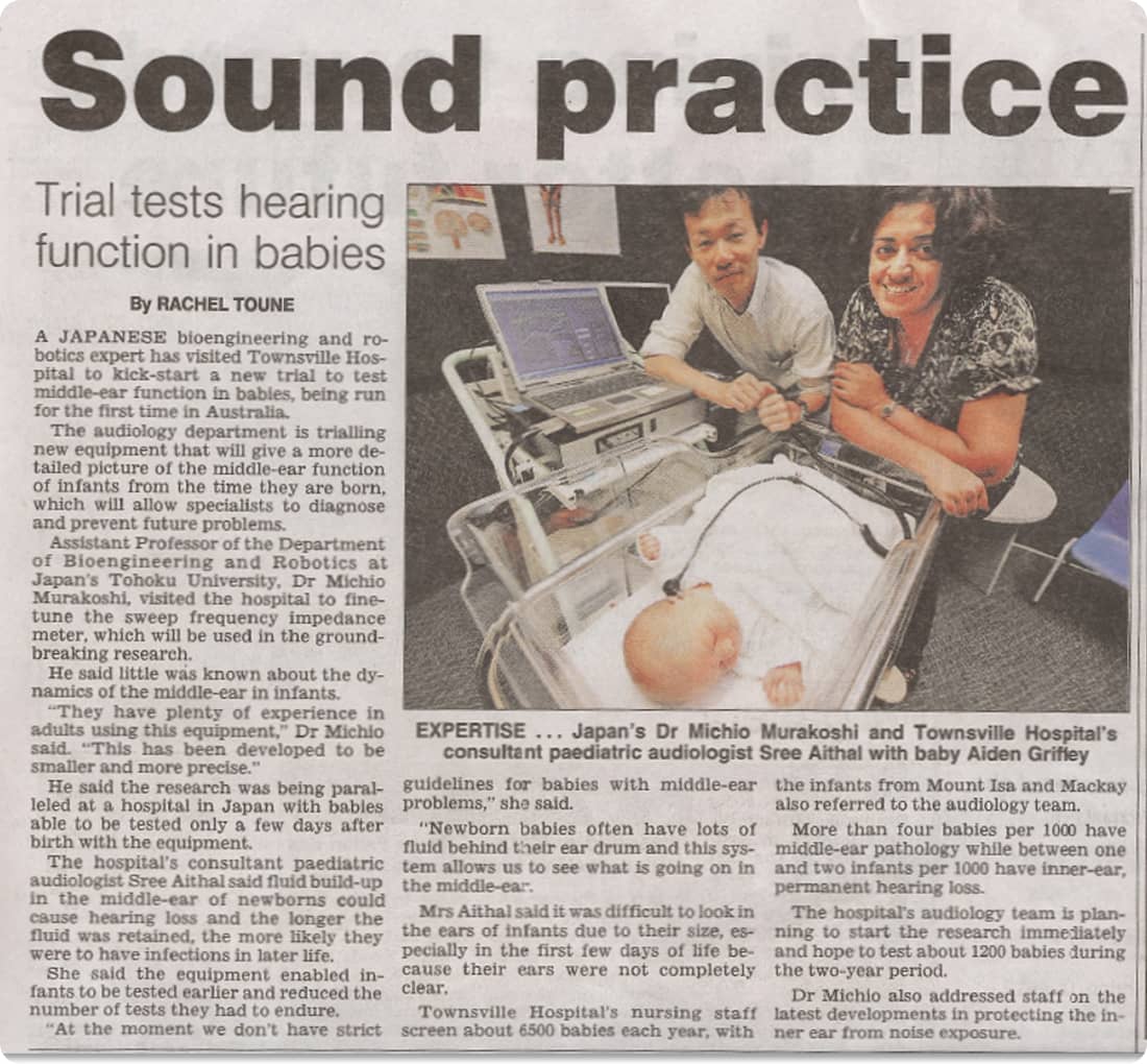 オーストラリアの病院との共同研究で、800耳以上の新生児のデータを解析。これにより「外耳道の壁も振動に影響する」という新たな知見が得られ、SFIメーター開発が大きく前進しました。